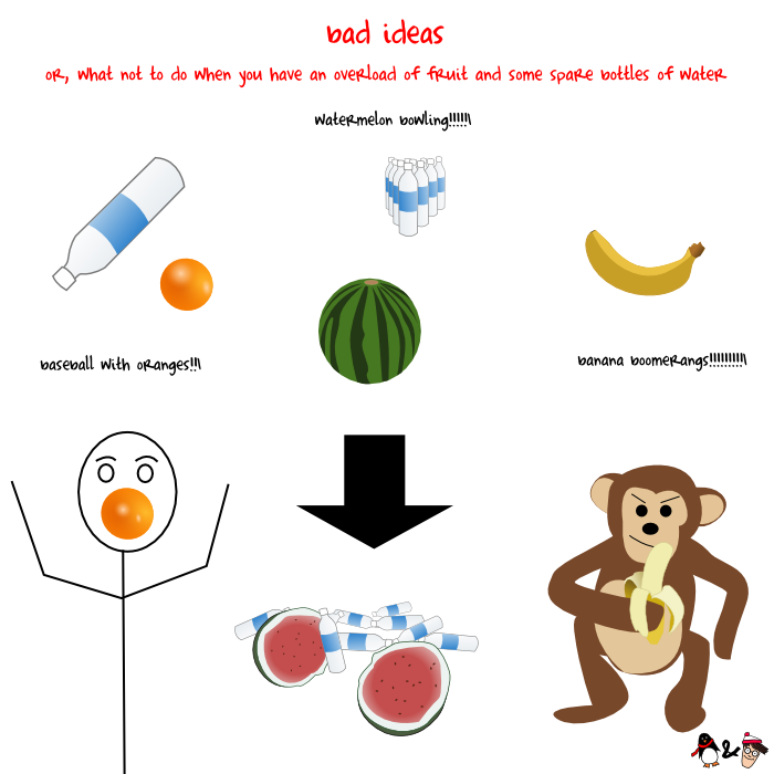 The watermelon bowling thing happened to me while on a trip to a particularly rural part of China. We managed to procure a whole watermelon but didn't have anything to cut it open with, so we decided to forgo eating it and just use it as a bowling ball instead. (There wasn't much to do in the area.)