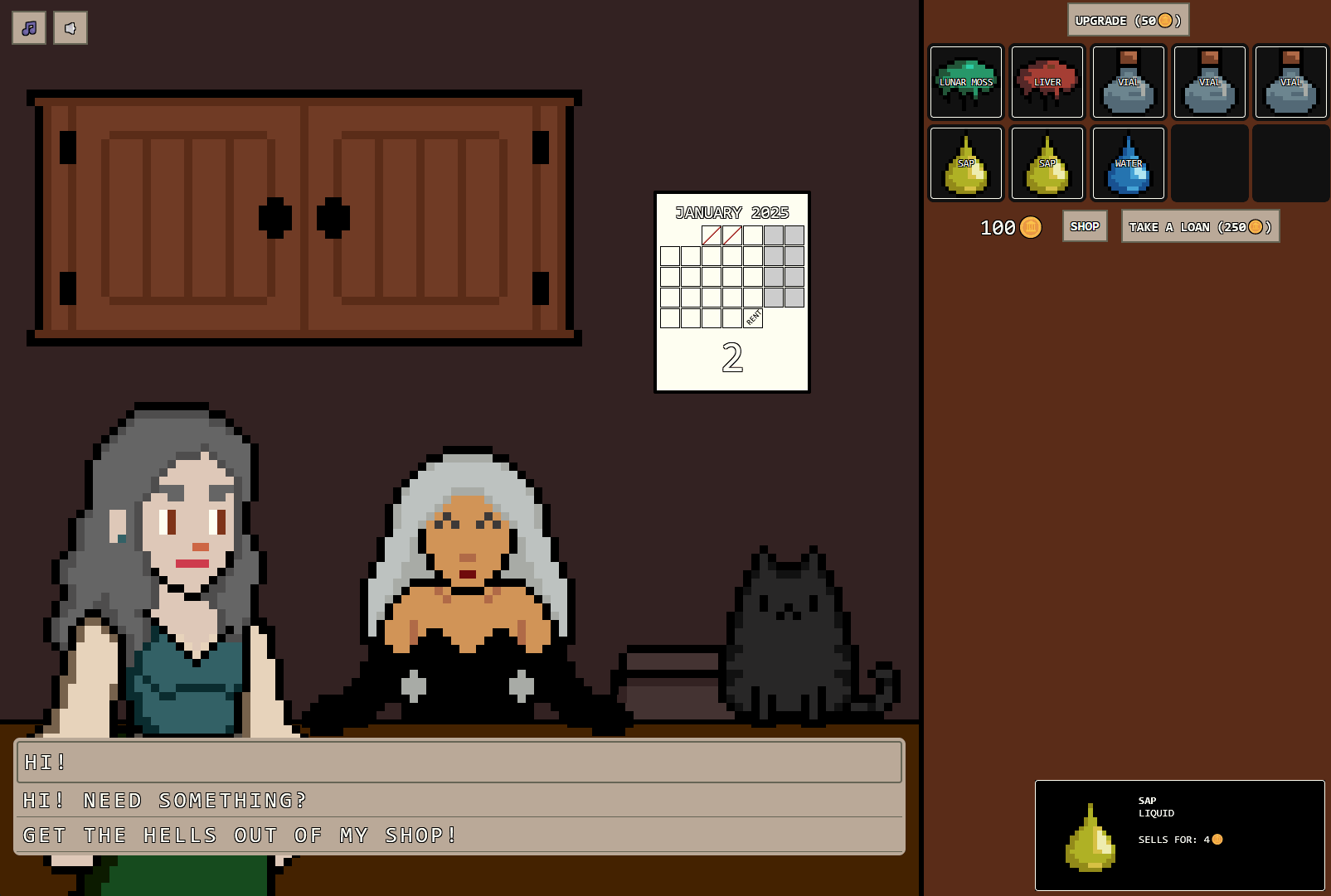 Brew and sell your potions to the villagers so you can pay rent, upgrade your shop and, more importantly, feed your familiar, otherwise she'll knock your potions and ingredients off the shelves.