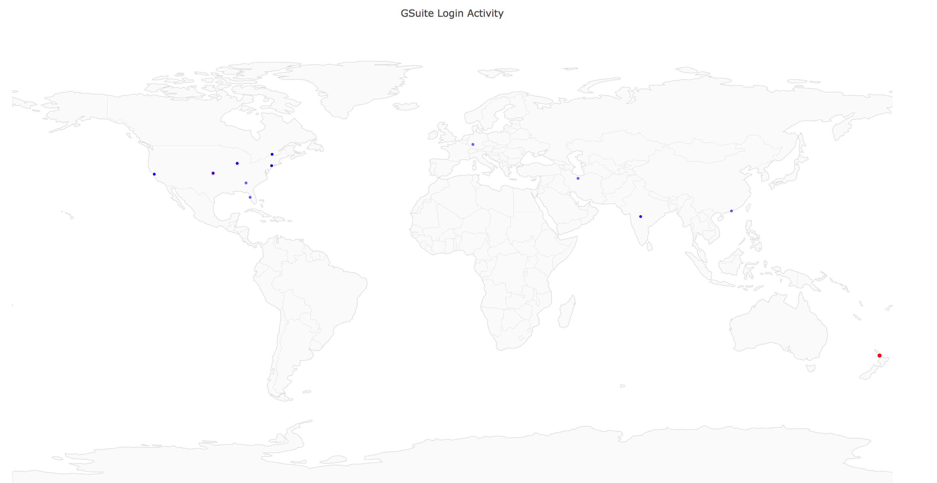 A recent engagement required me to analyze geographic login activity for a GSuite domain. While Google makes several reports available on the Admin dashboard, there was not one that provided thorough geographic detail. I made a thing that would take the default Login Activity Report, enhance it to include GeoIP data and plot all of the data points on an interactive map.