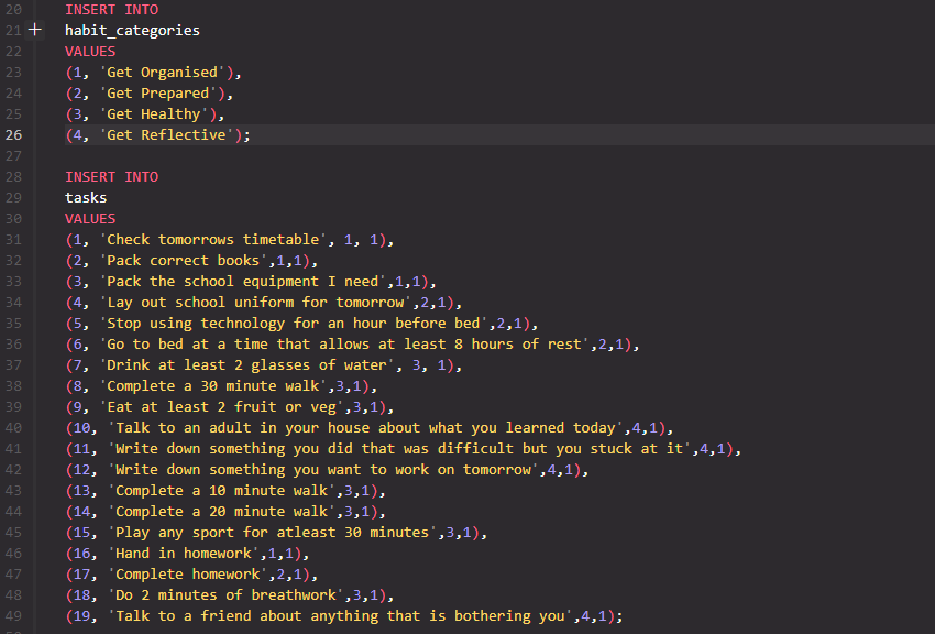 Choose the table you want to add a new row to / update an existing row. You can see a table name in the above image on lines 21 and 29 (habit_categories and tasks)