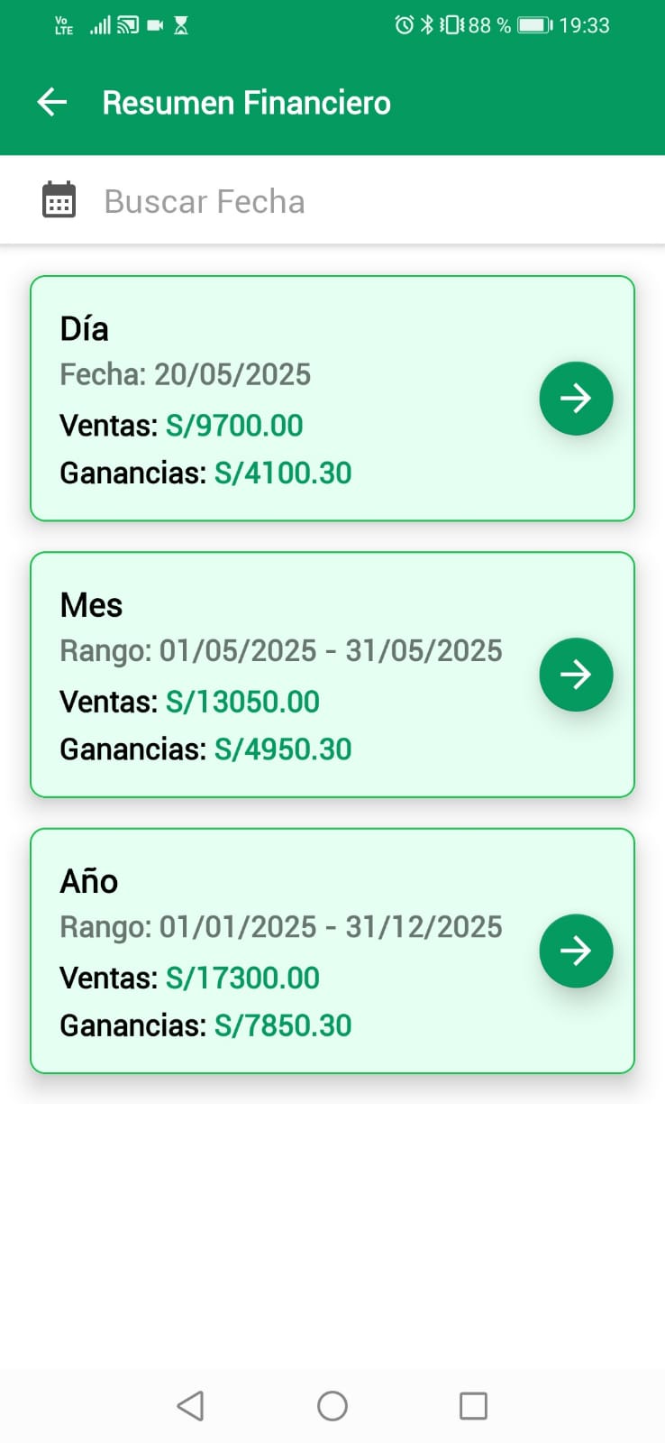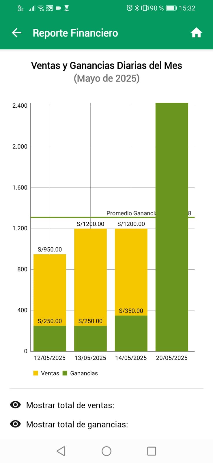 - Reportes financieros detallados (día, mes, año) con gráficos.