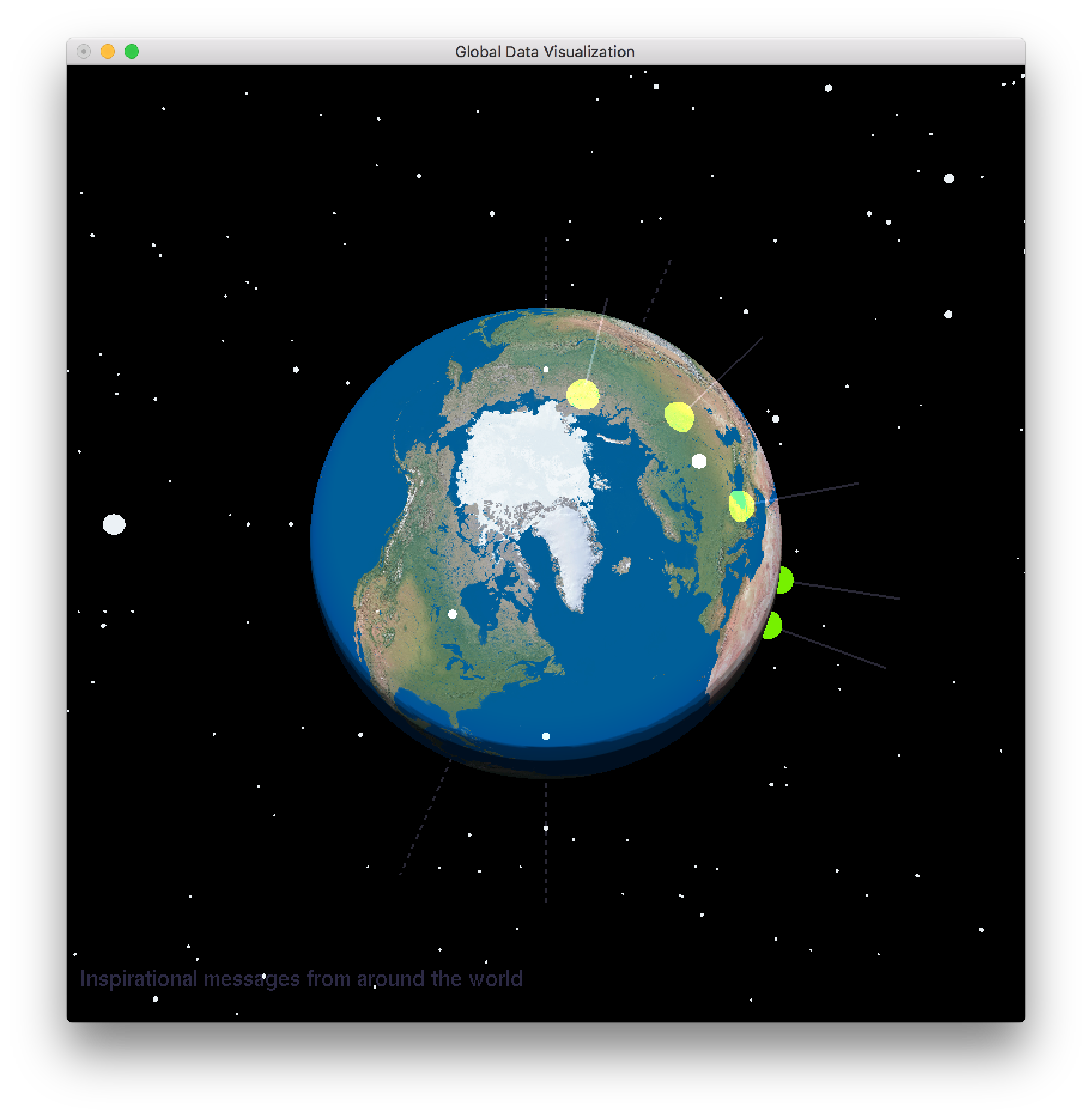 ##Description A 3D globe with inspirational messages from around the world mapped to different parts of the 3D globe. You click on the green globe (message) to display the inspirational message.