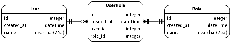 relationships: - User ||--0< UserRole - UserRole >0--|| Role