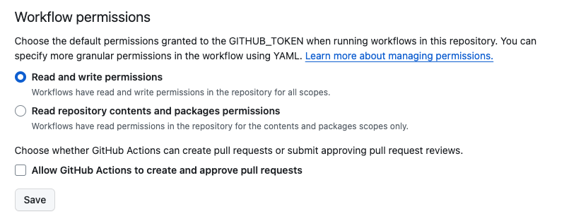 Settings > Actions > GeneralWorkflow permissions - Read and write permissions are checked.