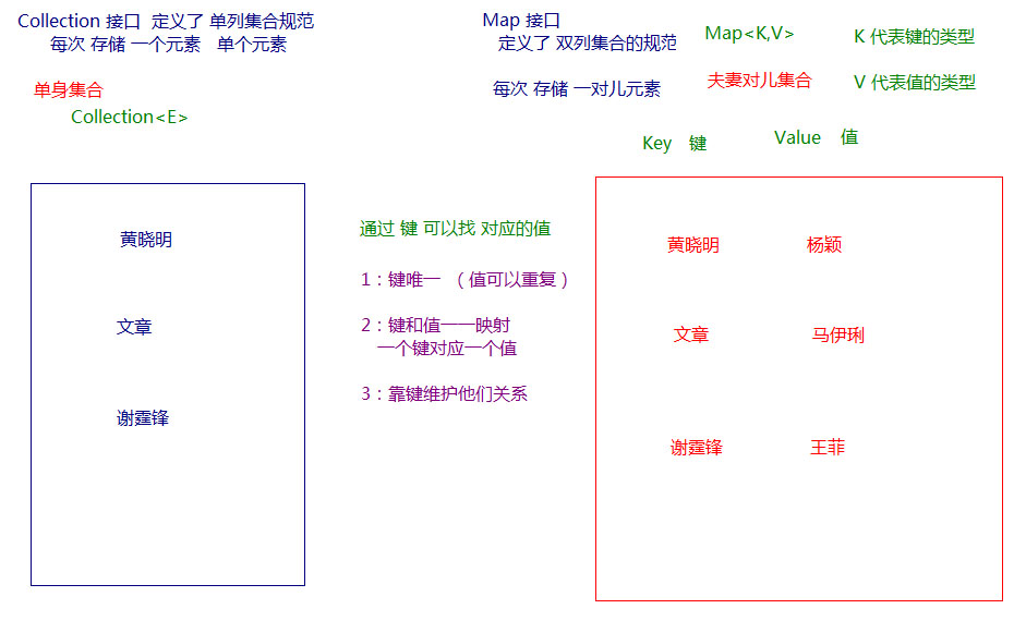Collection中的集合,元素是孤立存在的(理解为单身),向集合中存储元素采用一个个元素的方式存储。Map中的集合,元素是成对存在的(理解为夫妻)。每个元素由键与值两部分组成,通过键可以找对所对应的值。Collection中的集合称为单列集合,Map中的集合称为双列集合。- 需要注意的是,