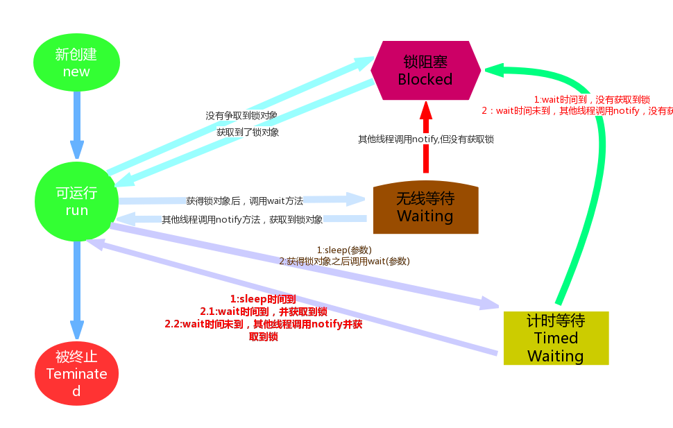 | Timed Waiting(计时等待) | 同waiting状态,有几个方法有超时参数,调用他们将进入Timed Waiting状态。这一状态将一直保持到超时期满或者接收到唤醒通知。带有超时参数的常用方法有Thread.sleep 、Object.wait。 |