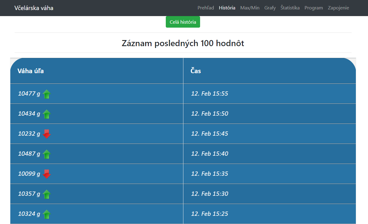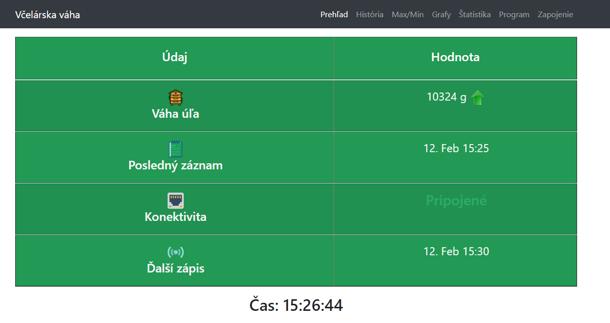 Webaplikácia ponúka používateľské rozhranie s prehľadom údajov v reálnom čase, spojenie s MySQL databázou, kde ukladá dáta z mikrokontrolérov.