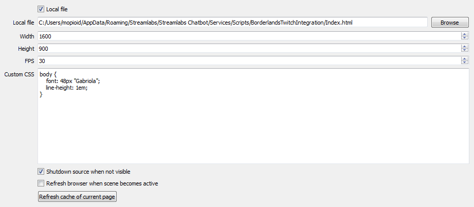 - Testing Mode: Disable Borderlands Twitch Integration messages in chat. Instead, messages can be viewed in Chatbot's script logs (found in the top right of the Scripts pane). Also, placeholders will be inserted in the stream overlay when there is nothing else to display.