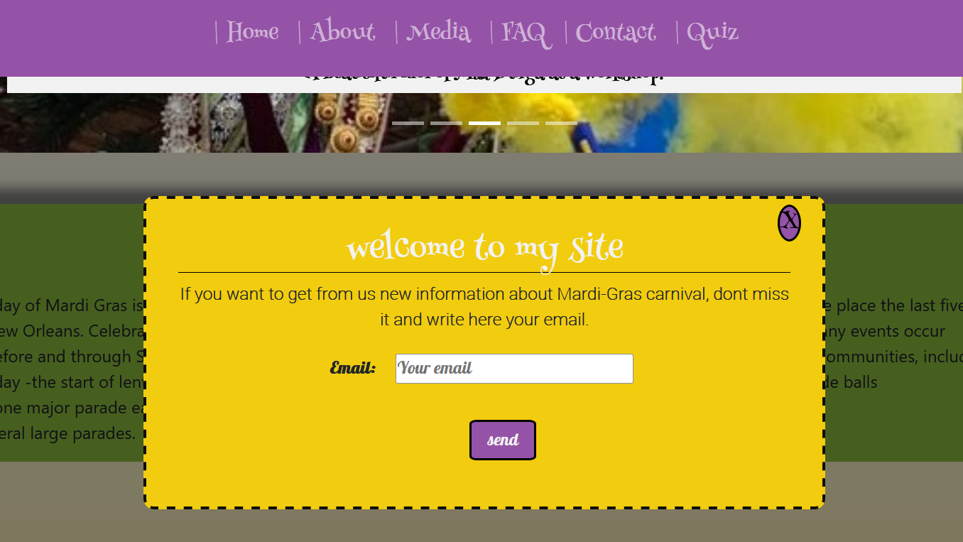 We were given a project as part of our studies to create a website of carnival named: "Mardi-Gras". The holiday of Mardi Gras is celebrated in all of Louisiana, including the city of New Orleans. It is filled with parades, balls and other celebrations leading up to Mardi Gras, which is French for “Fat Tuesday.”