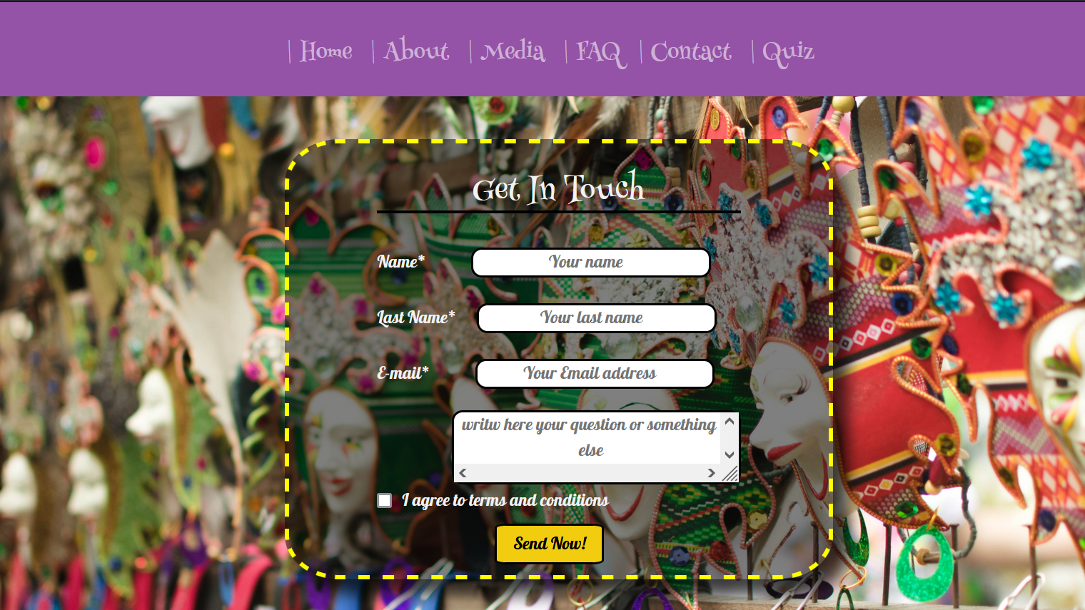 On the fourth page, there are common questions and answers. The next page will show a contact form and the location of the city. On the last page, I have made a little quiz about this carnival.