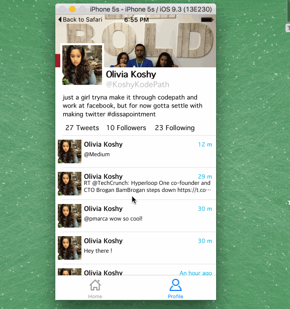 - User can switch between timeline, mentions, or profile view through a tab bar (minus mentions)