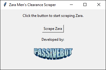 scrape_clearance_items- This function scrapes clearance items from the Zara website and stores them in a SQL database. It takes in a URL as the parameter and returns a list of dictionaries containing the product information.MainWindow- This class creates a GUI window with a button to start the scraping process. When the button is clicked, it calls thescrape_clearance_itemsfunction.