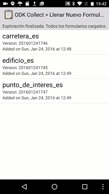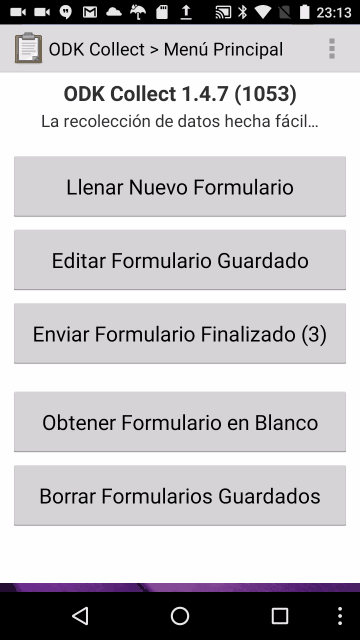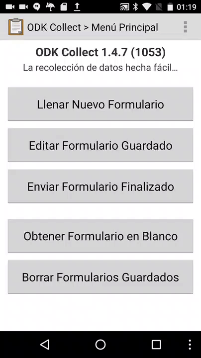 -Abra desde su dispositivo movil el OpenDataKit Collector, introduzca sus credenciales de Ona y descargue los formularios desde Ona: