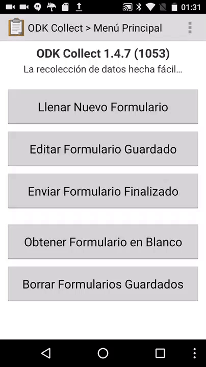 En el menú principal de ODK Collect vaya a Obtener Formulario en Blanco para descargar los formularios desde el servidor de OMK.