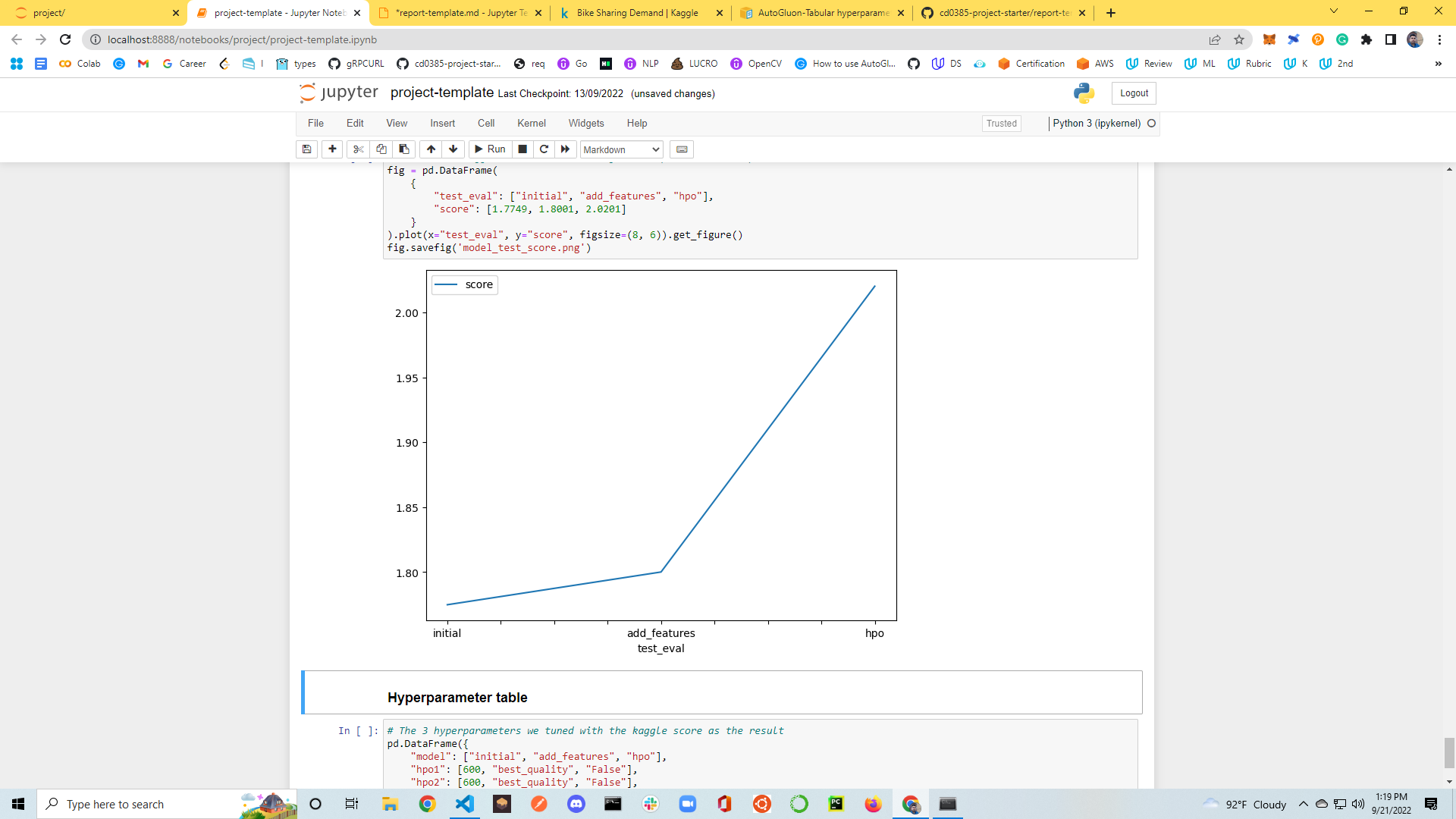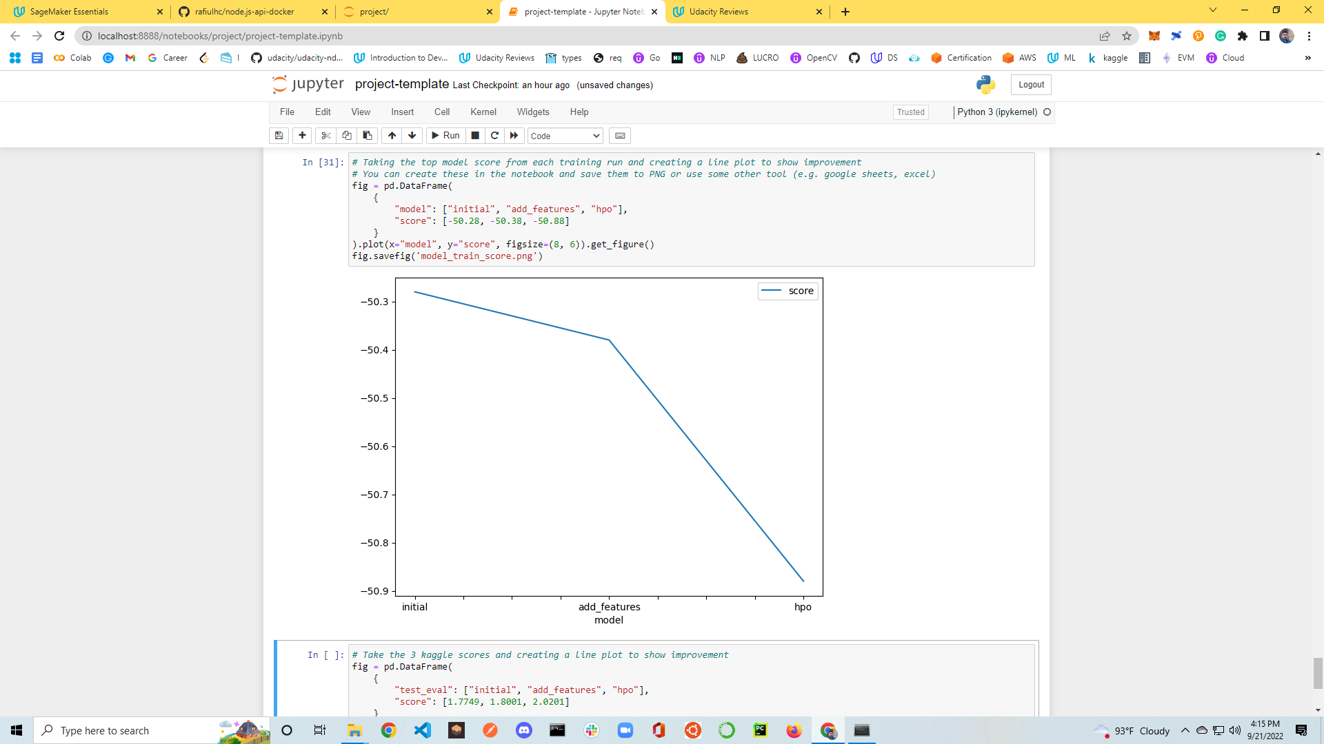 Create a line plot showing the top kaggle score for the three (or more) prediction submissions during the project.