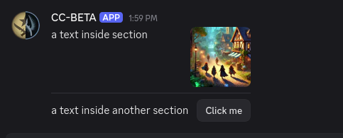Sections allow you to add text, along with a thumbnail or button inside a container. A section should contain at least one text and one accessory (image or button). If you are putting this inside a container and want only the thumbnail to be a spoiler, use {spoiler:yes} inside the section.