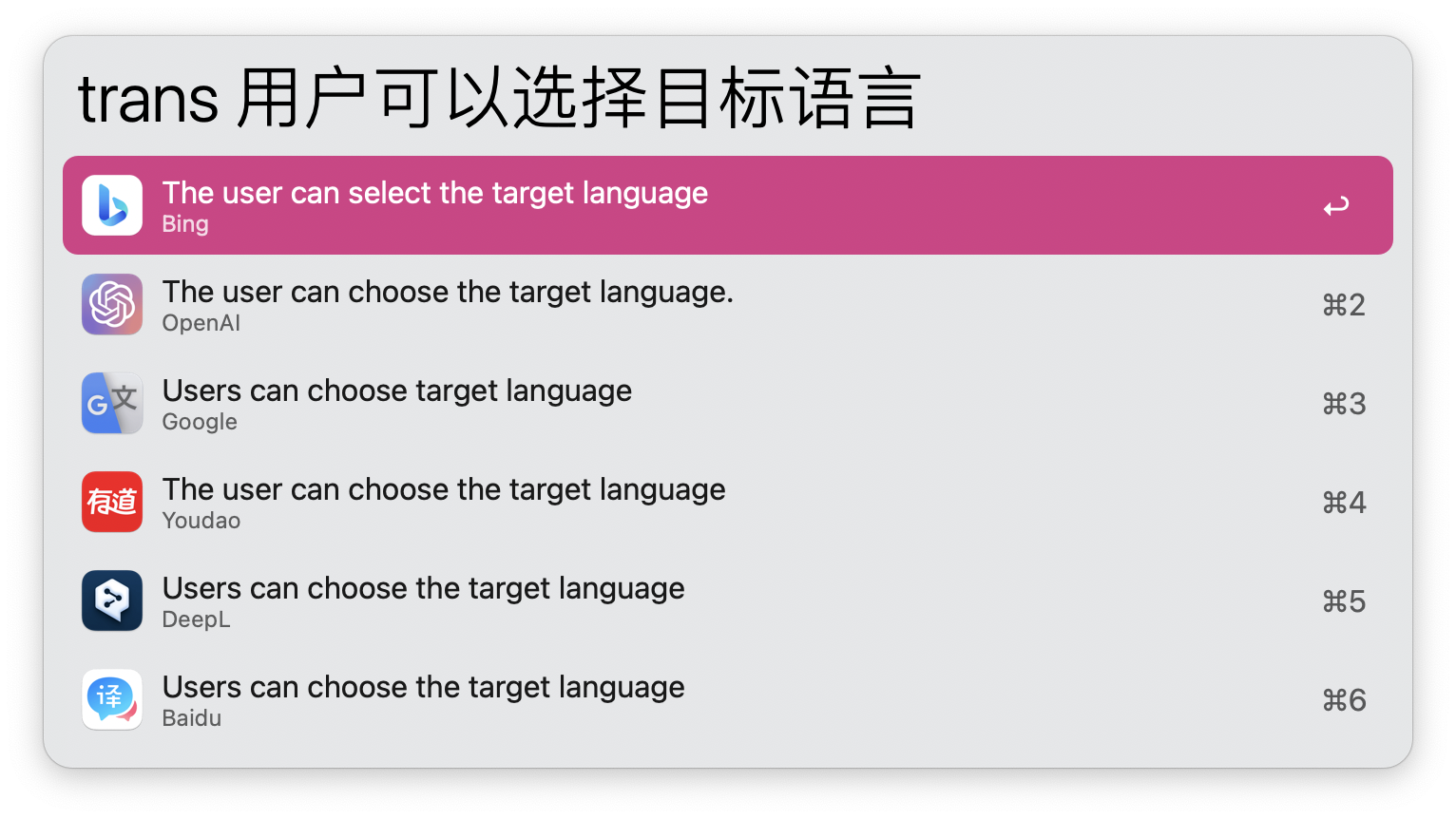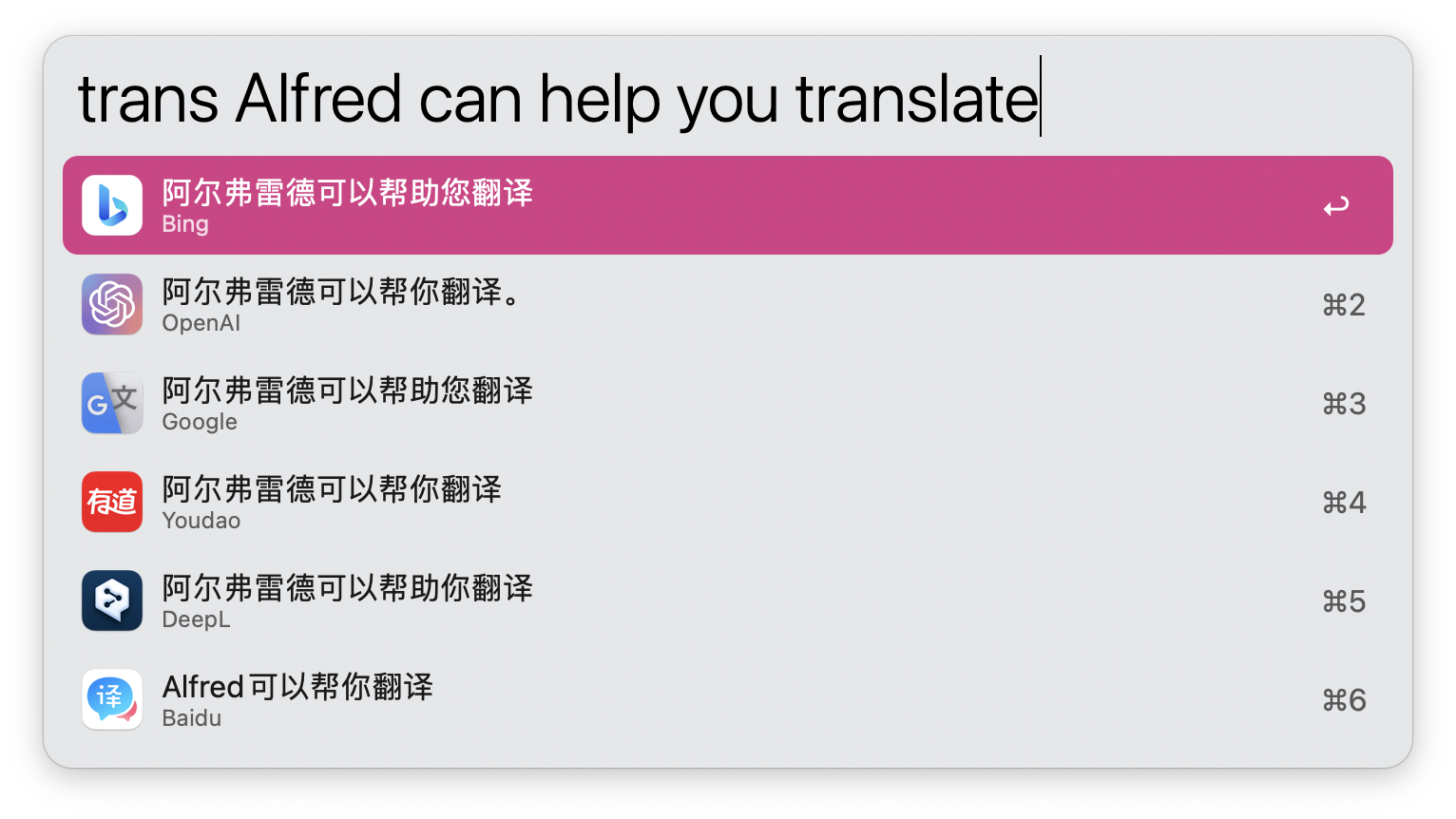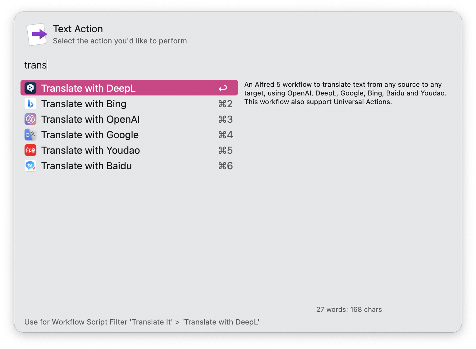 An Alfred 5 workflow to translate text using OpenAI, DeepL, Google, Bing, Baidu and Youdao. This workflow also supports Universal Actions.