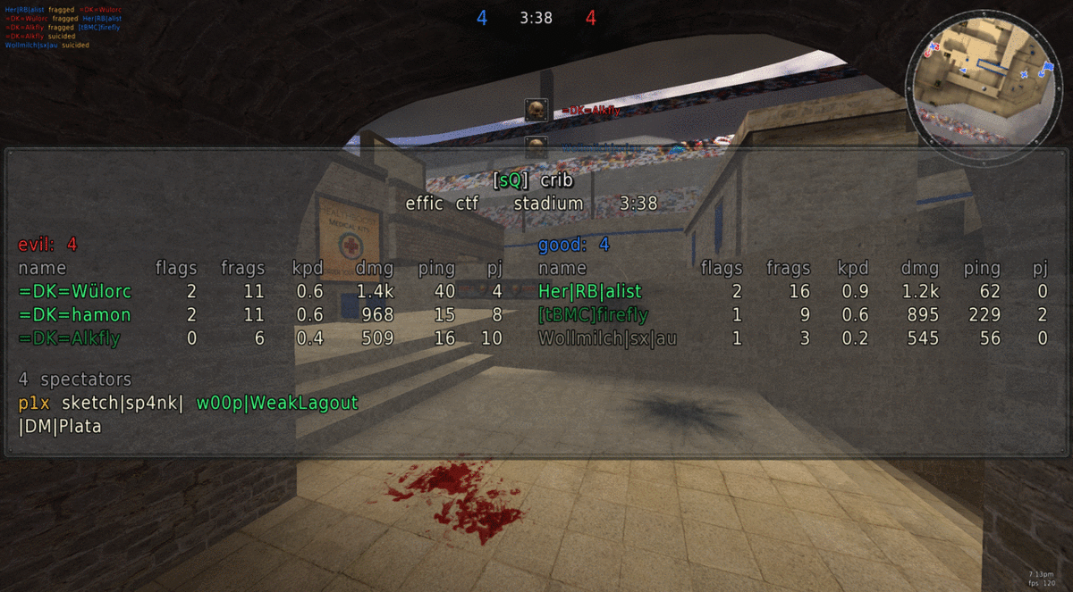 showflags: when 1, shows the number of flags scored by a player; always hidden in non-flag modesshowsuicides: when 1, shows how often each player suicidedshowkpd: when 1, shows each player's frags/death ratioshowaccuracy: when 1, shows each player's overall accuracyshowdamage: when 1, shows each player's overall damage dealt; when 2, shows each player's overall net damage (= dealt - received); always hidden in insta modesshowdamagereceived: when 1, shows each player's damage received