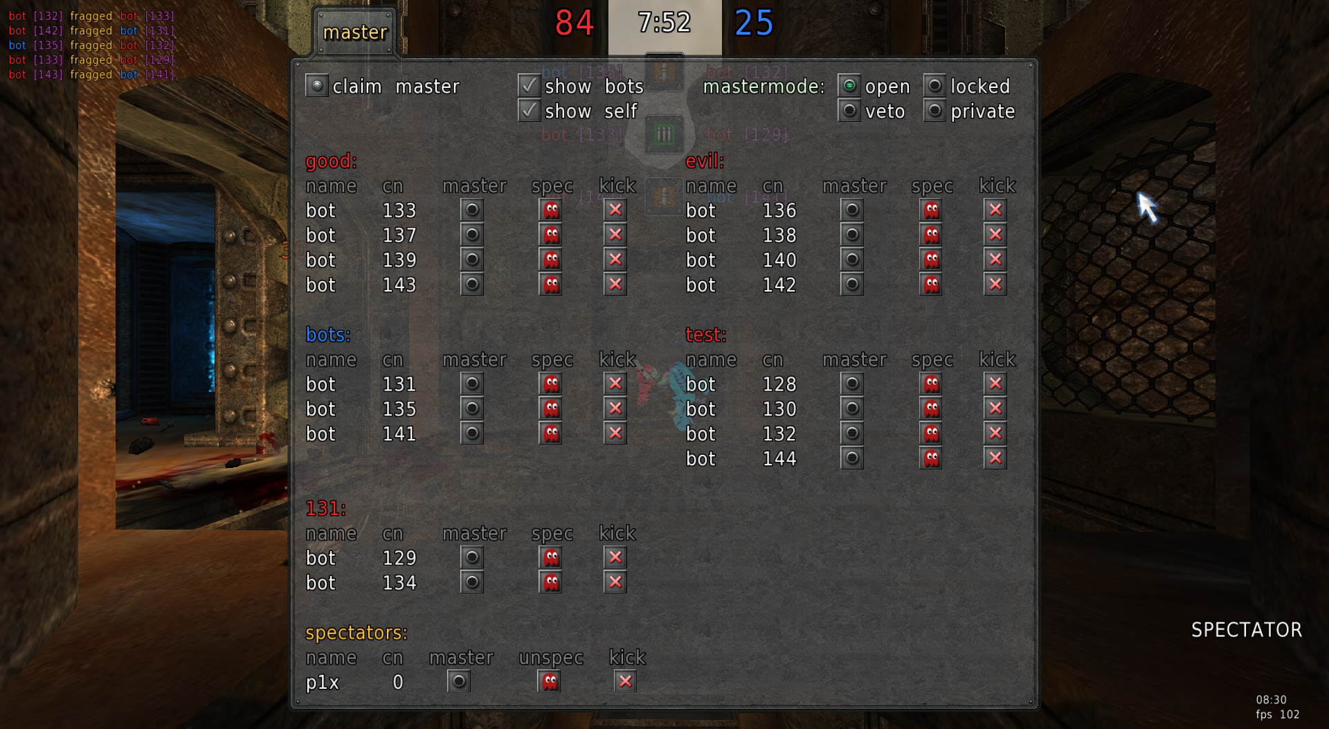 This lets you see wether a player connected to the same server as you is using p1xbraten, and what version. It relies on p1xbraten clients sending additional packets to the server, which the server then broadcasts to all other clients. This means other players can tell you're using p1xbraten (and what version). No information other than "I use p1xbraten, version X.Y.Z" is sent. No information is sent to me (p1x) or any third party. Opt out if you are firefly!