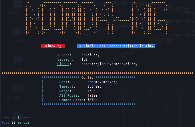 ./nimd4 -t scanme.nmap.org -r 1-100Common Ports (1002)