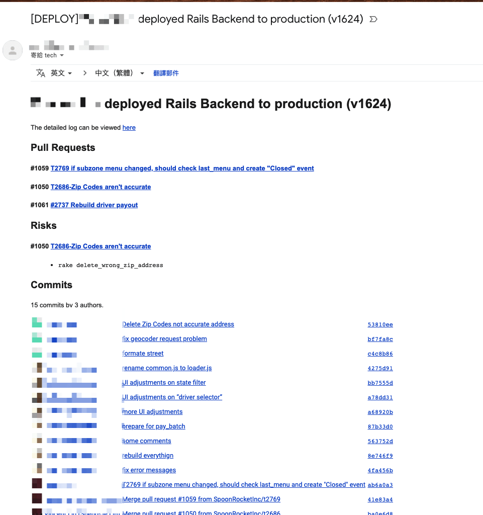 然后,技术团队界接上自动部署系统。每一个版号会收集程序员推送的功能 patch 成开发日志。