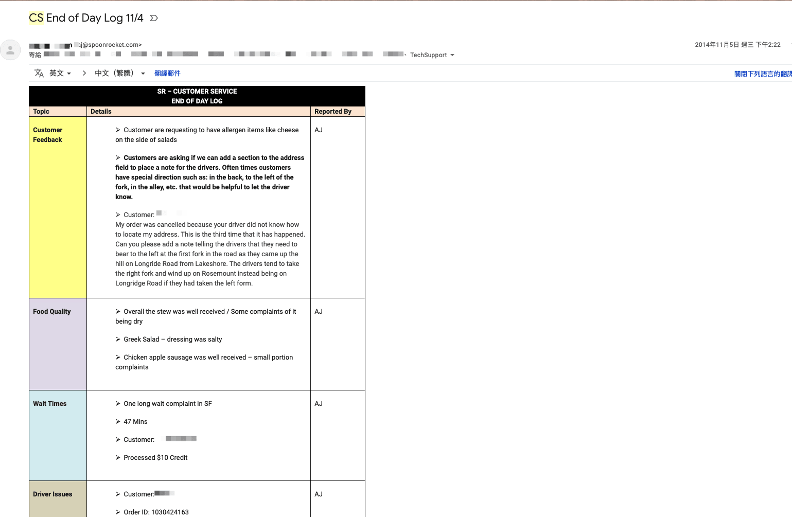 比如客服团队就会寄这样内容的汇总,给技术团队,回报它们当班遇到的各样问题,并由技术团队去开票排进隔天的工作优先级里面。