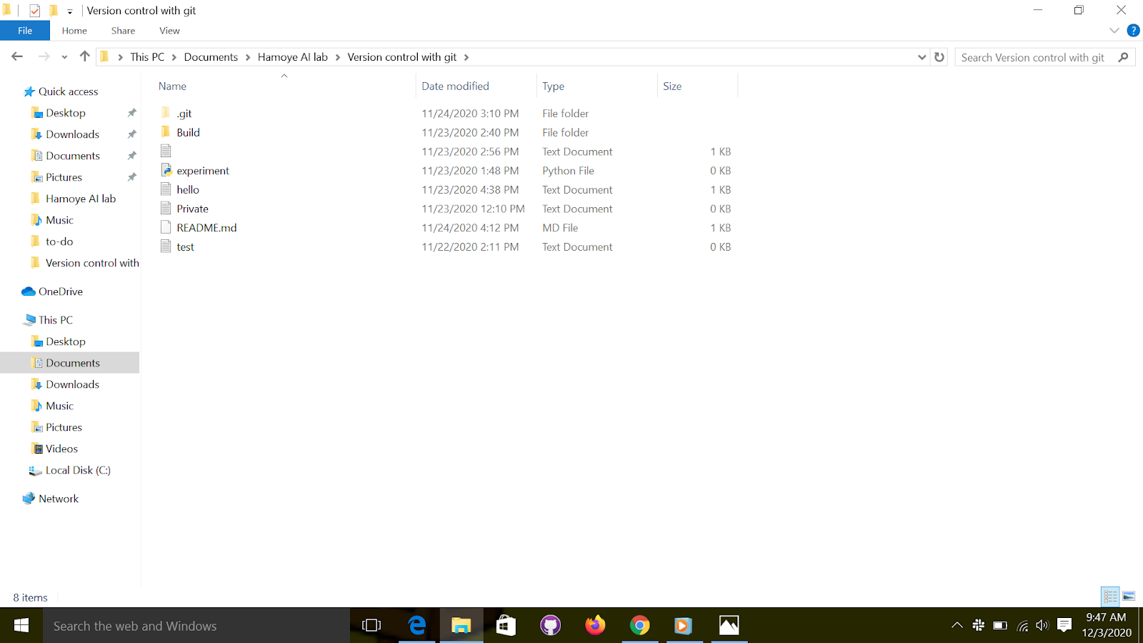 Go back to "git bash" and run the "git status" command. Notice the change, that is because git noticed that the project has changed. Make sure that you place your new file alongside the .git directory like in figure below, not into it!