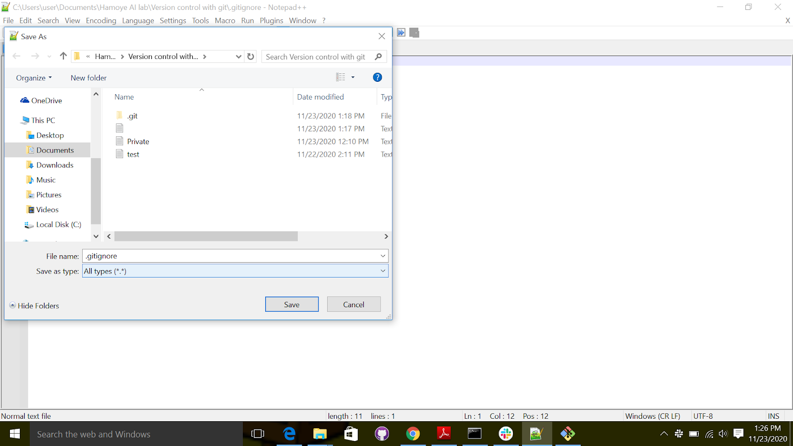 - Save file as; filename : .gitignore, save as type: all text