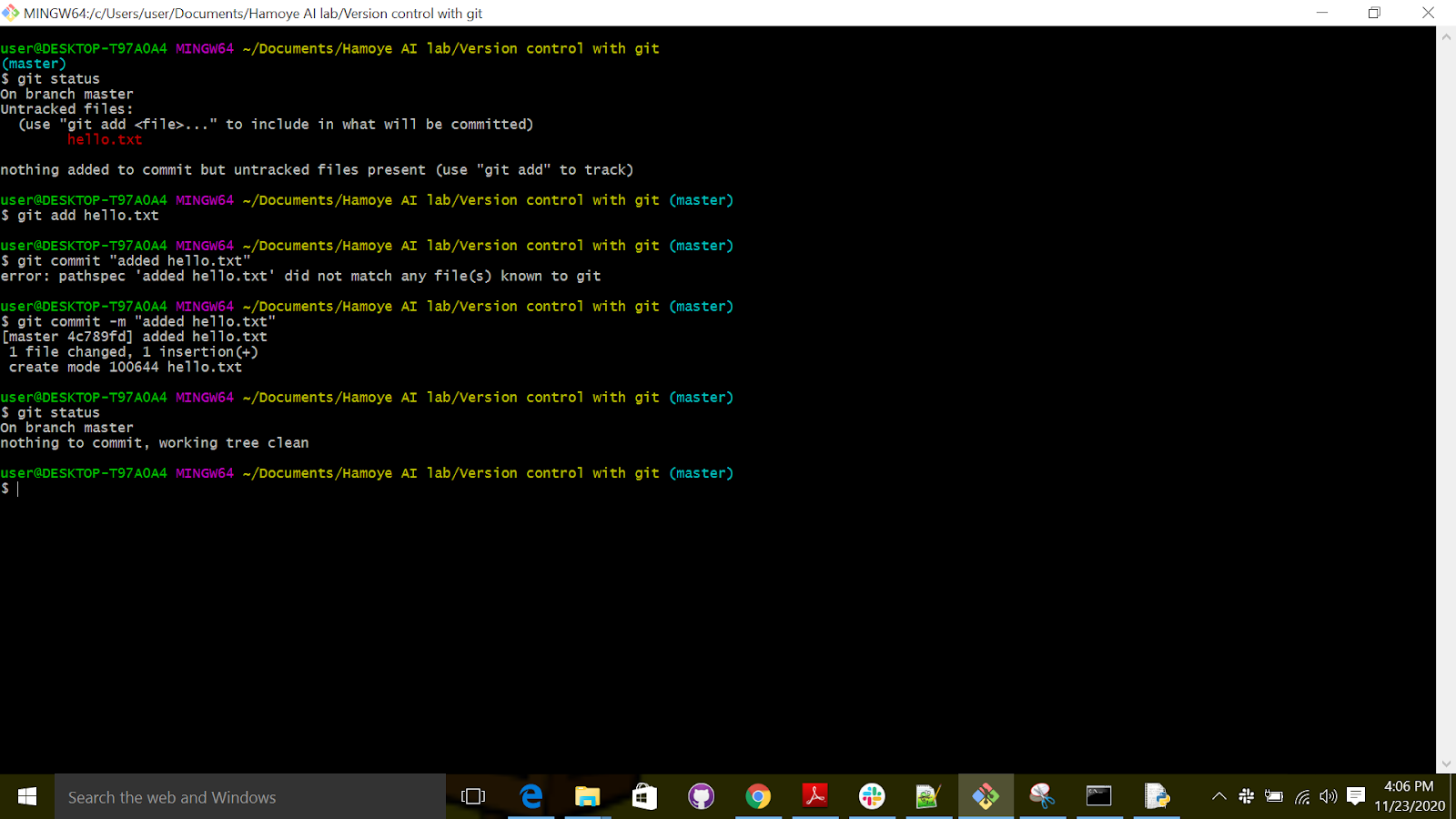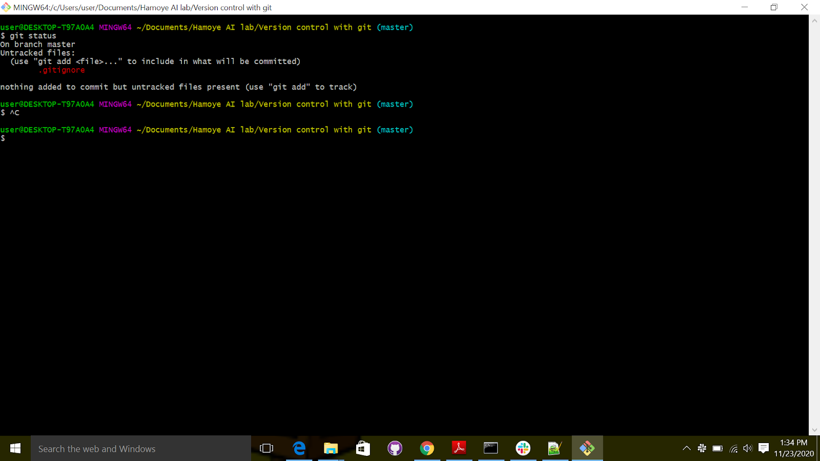 This is telling you that you need to add the file you just created to the staging area so it can be tracked. Therefore, to add the file we go to the "git bash" and run the following command: