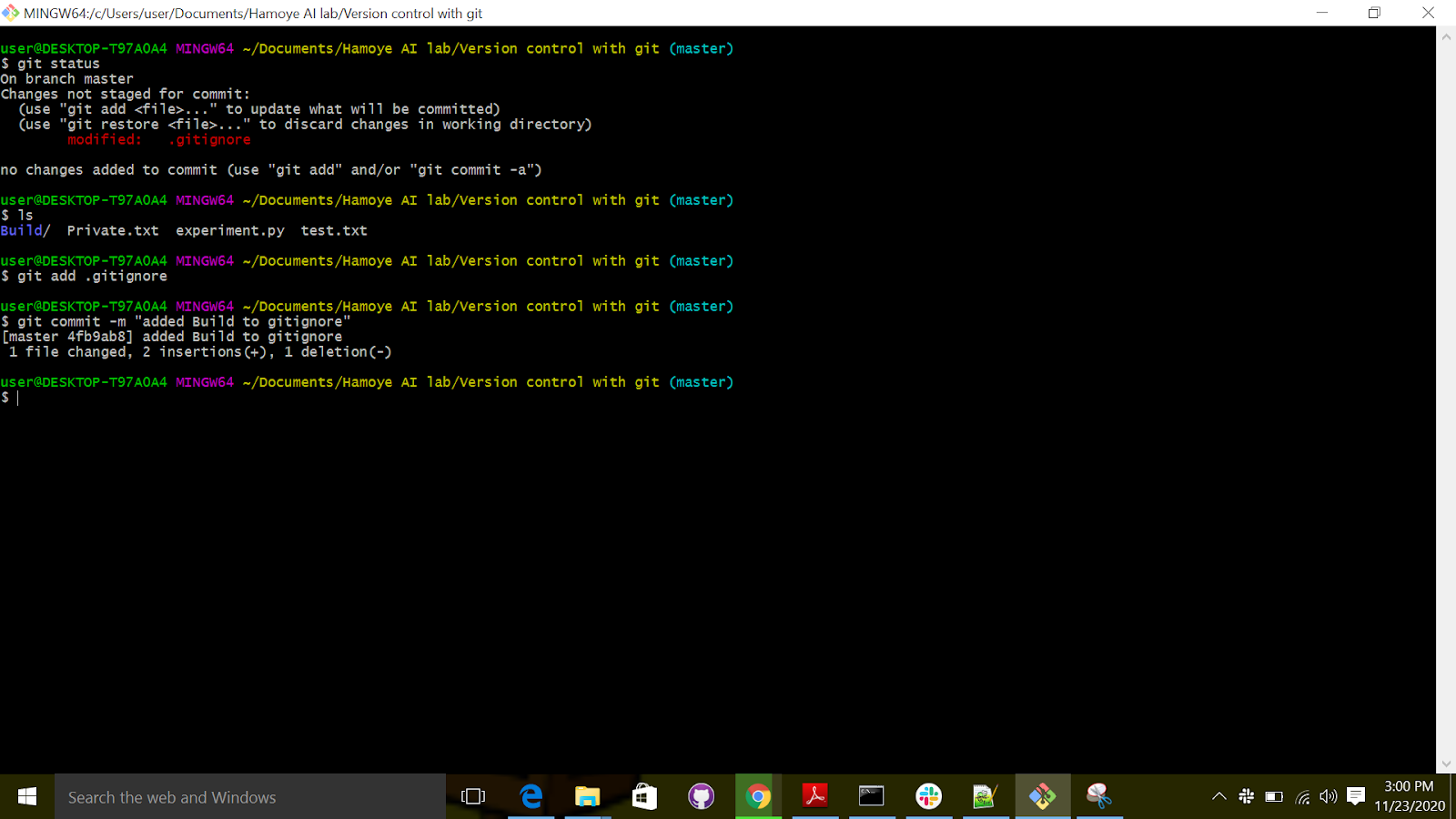 As you can see on the status shown in image above, Private.txt is not tracked. You can also see that the .gitignore file is tracked; you will therefore have to add and commit it after you modify it. We simply use the git add and git commands.