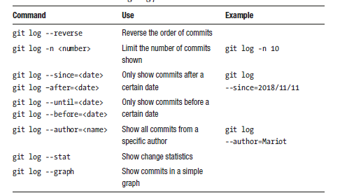 There are many parameters you can use with git log; The table below is presenting them to you.