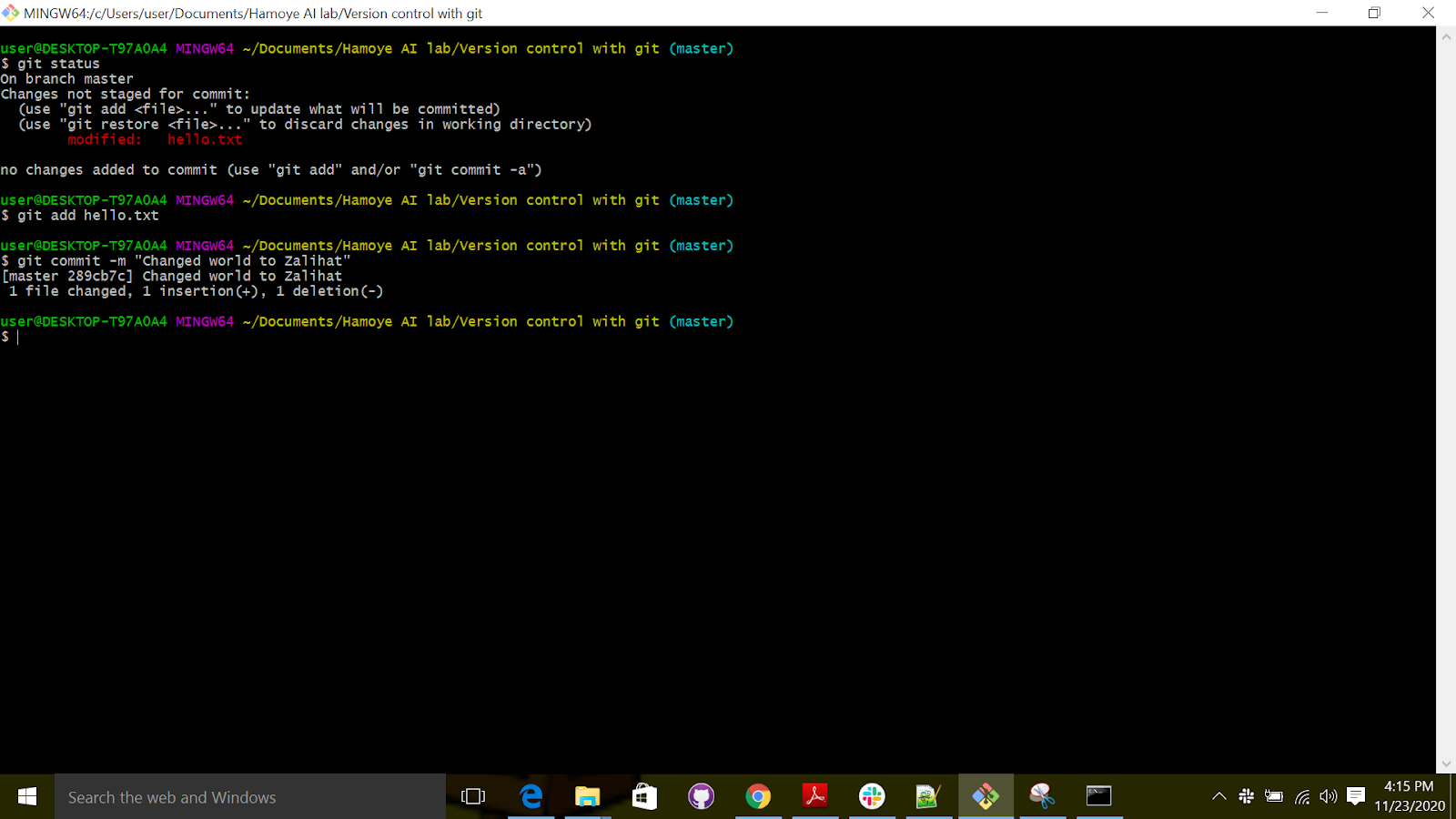 Open "git bash" inside the folder created earlier, use git status to check the status of the repository, git add to stage the changes and commit to commit the changes.