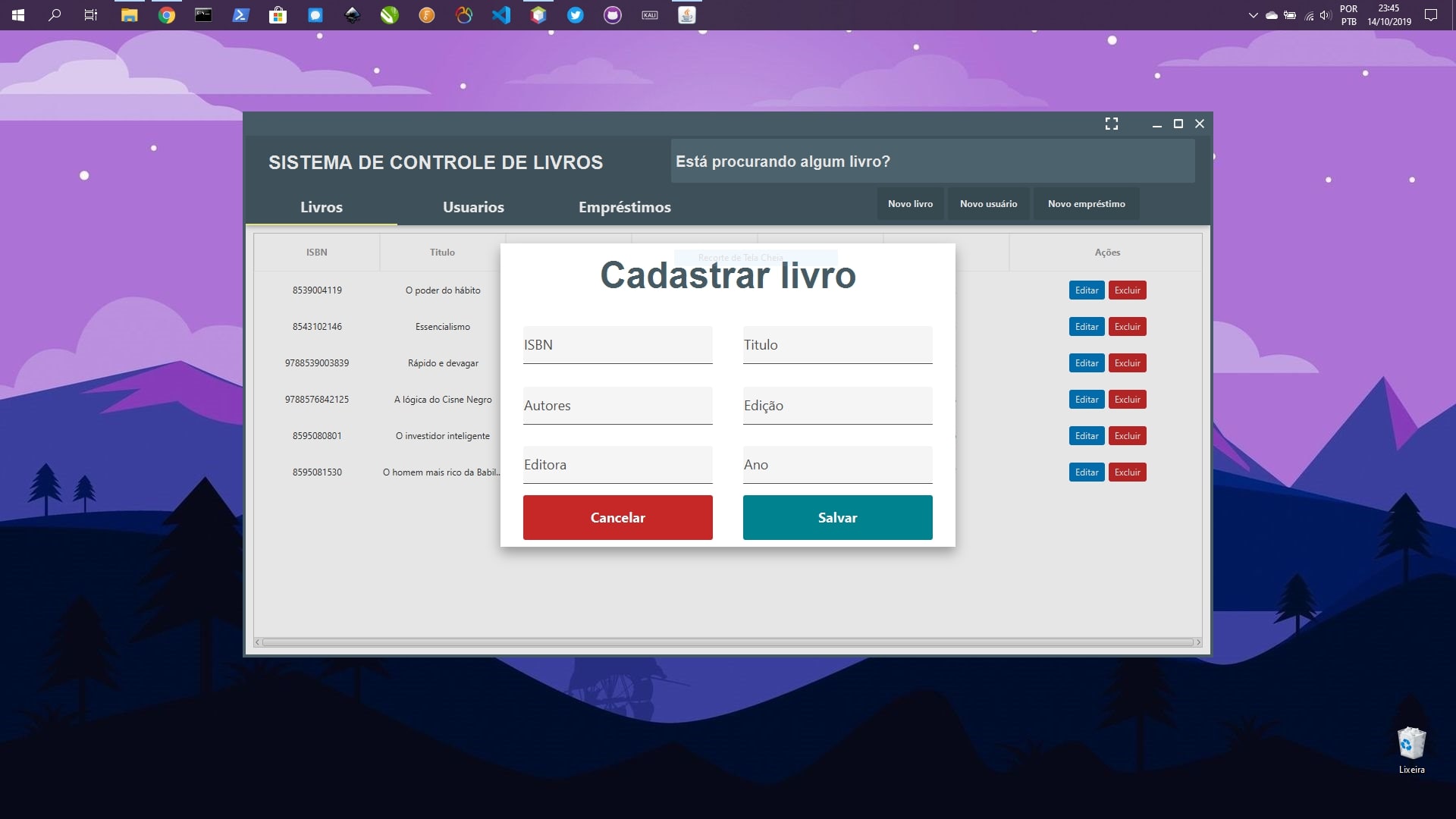 Deve ser possível cadastrar livros: incluir livros, alterar livros, excluir livros, listar livros, buscar livros pelo ISBN, por parte do título e pela editora.